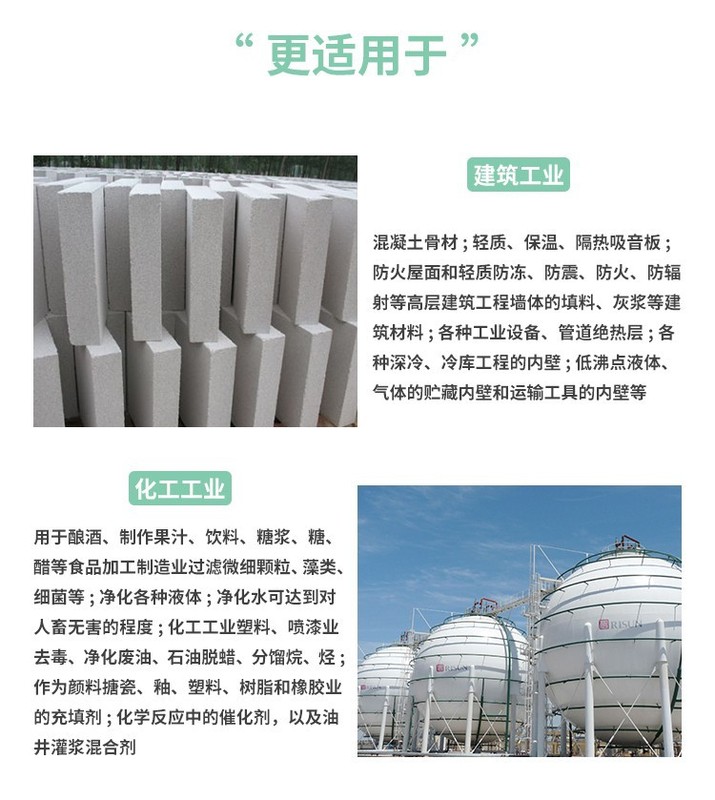 - 適用範圍:建築防火、保溫隔熱、花卉園藝