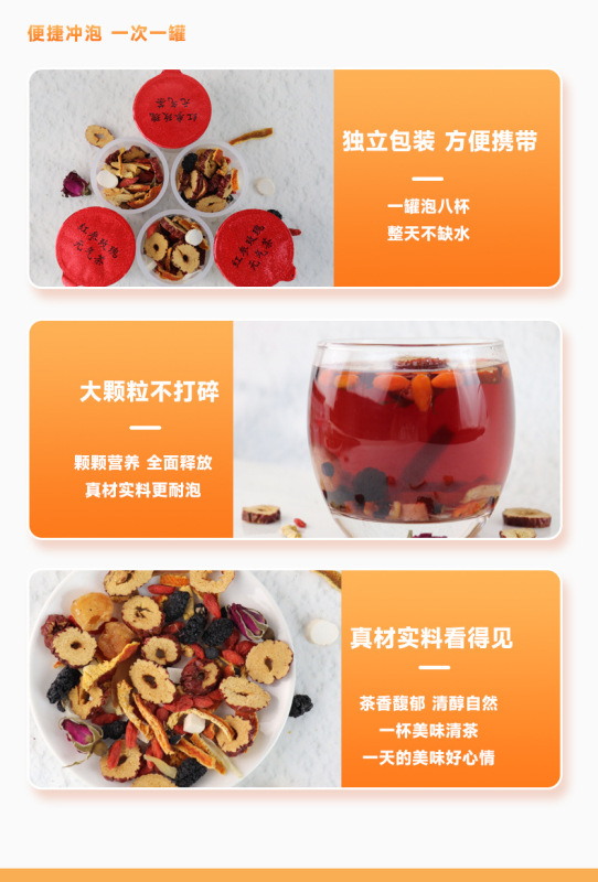 - Ingredients and Accessories: Jujube, Mulberry, Tangerine Peel, Goji Berry, Longan, Poria, Yam, Red Ginseng, Double-layered Rose, Lily Bulb, Black Goji Berry
