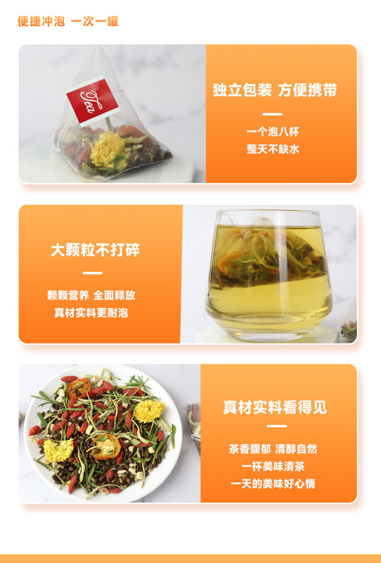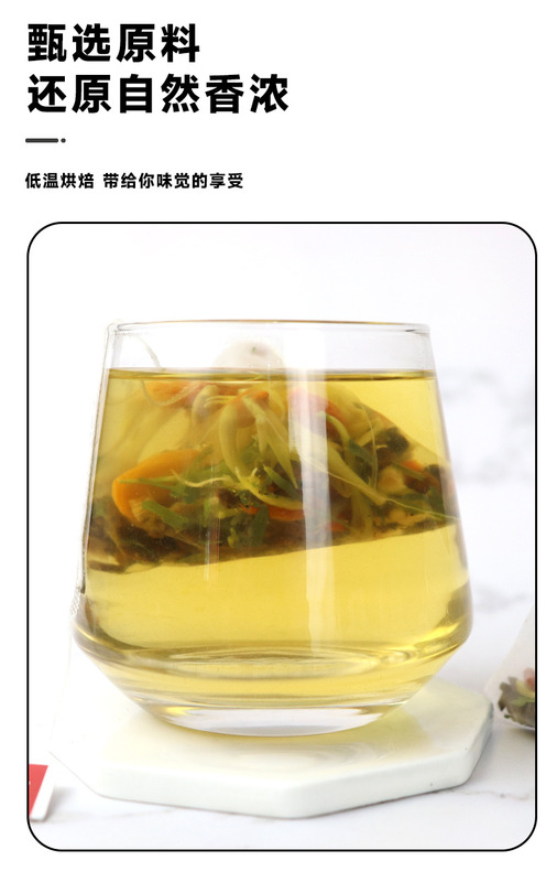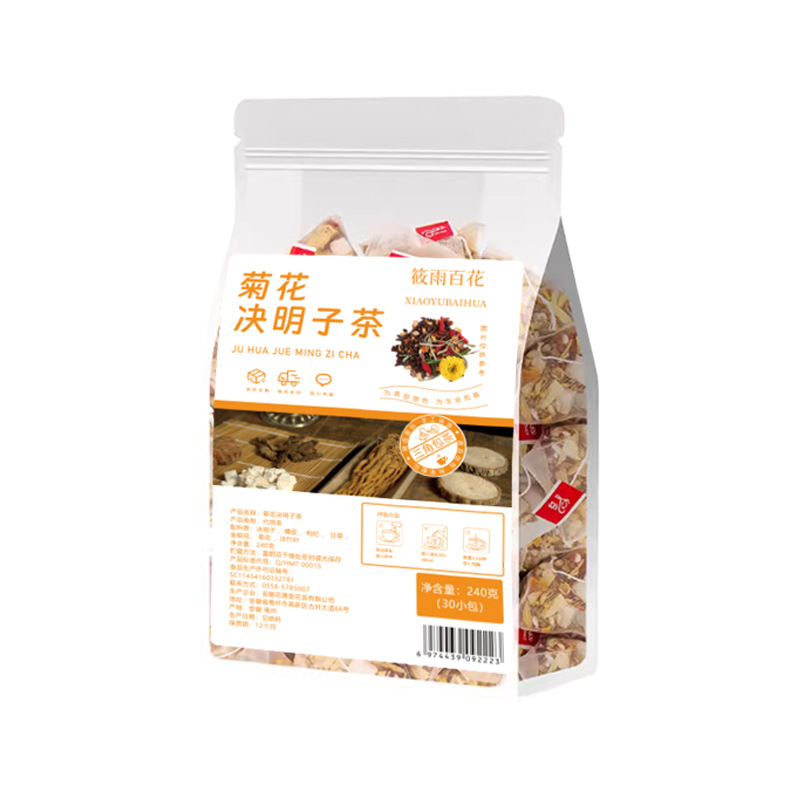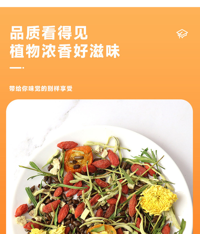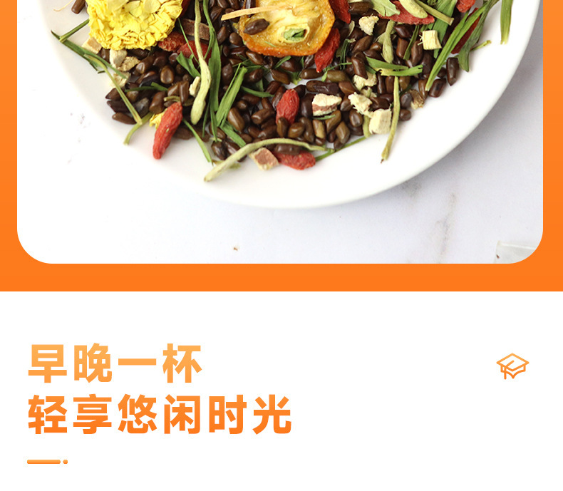 - 原料與配料:決明子、橘皮、枸杞、甘草、金銀花、菊花、淡竹葉