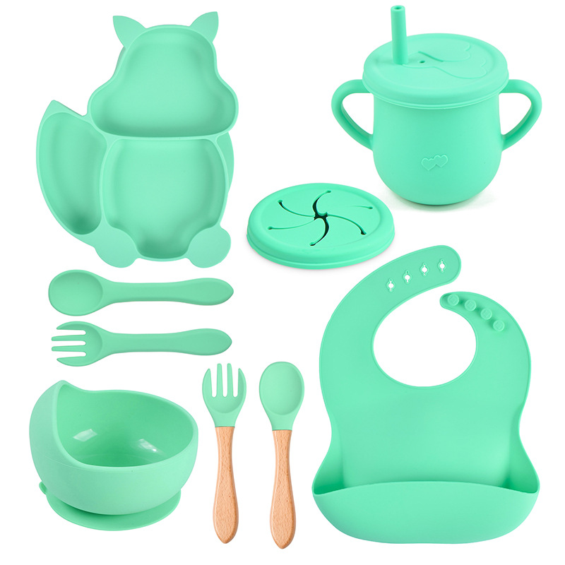 - Specification: B Squirrel Plate + Bowl + Bib + Straw Cup + Snack Cover + Silicone Spoons & Forks + Wooden Spoons & Forks