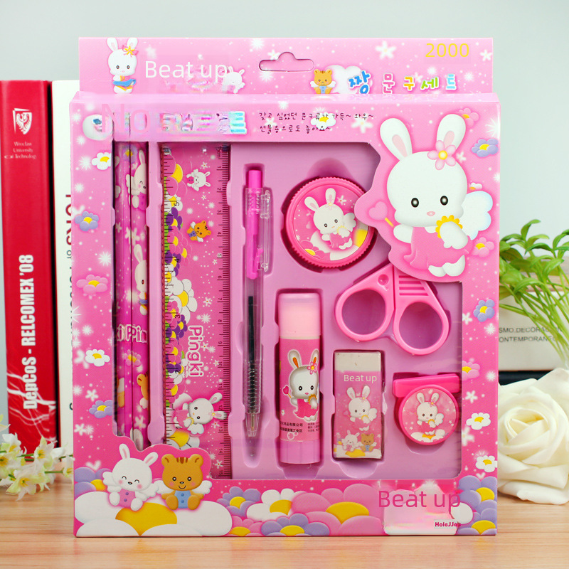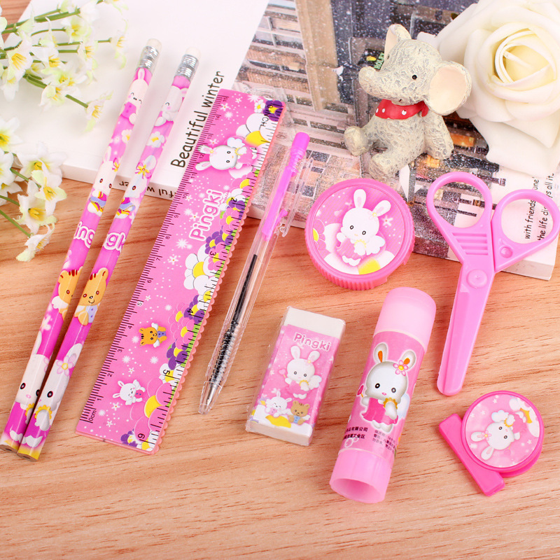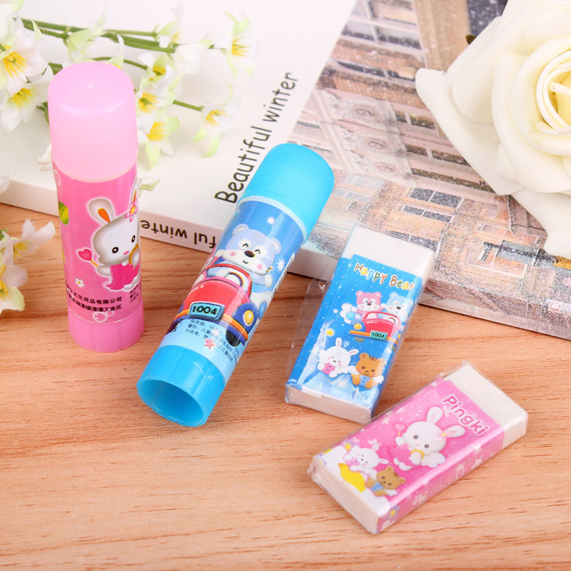 - Components: 2 pencils, 1 ballpoint pen, 1 solid glue, 1 pencil sharpener, 1 ruler, 1 eraser, 1 bookmark, and 1 pair of scissors
