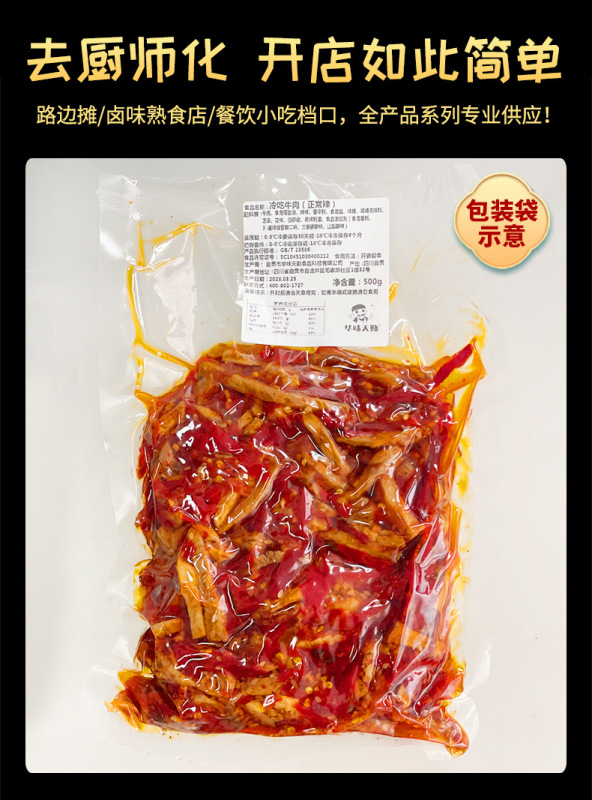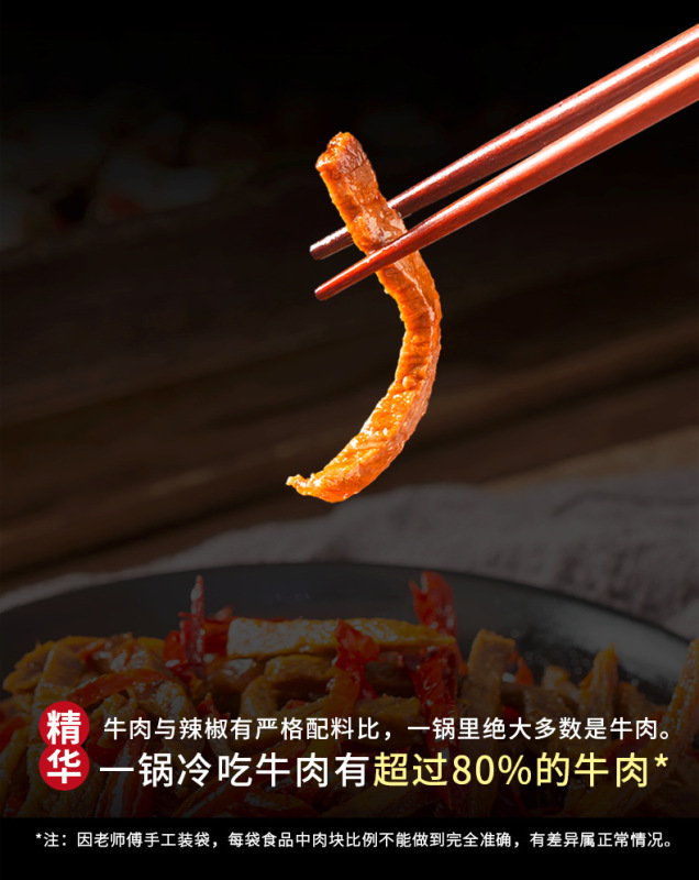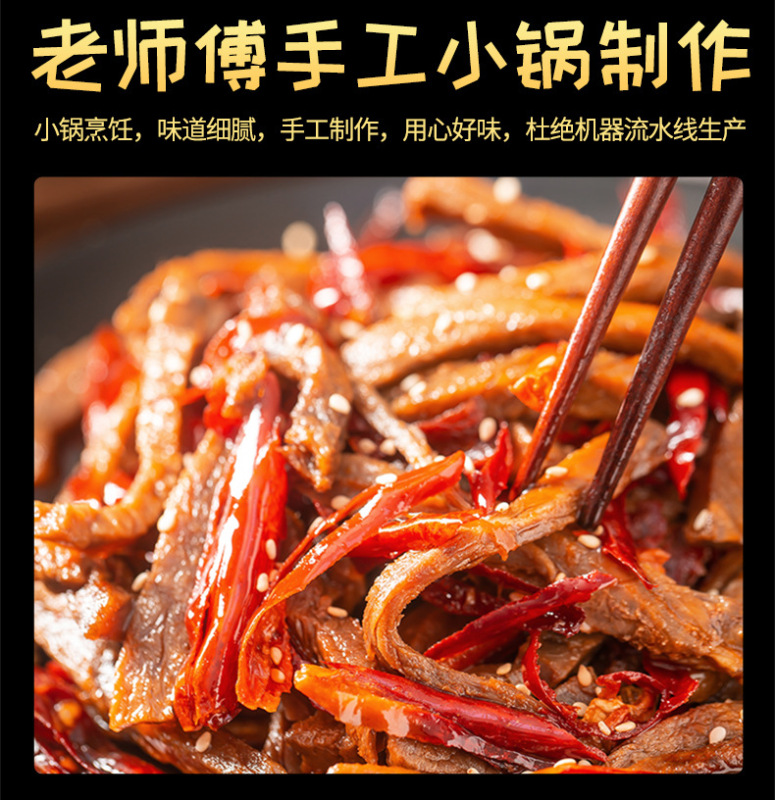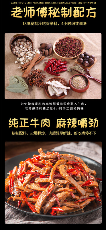- 原料和配料:牛肉、食用植物油、食用鹽、白砂糖、辣椒、花椒、芝麻、香辛料、味精、雞精調味料、調味料酒。