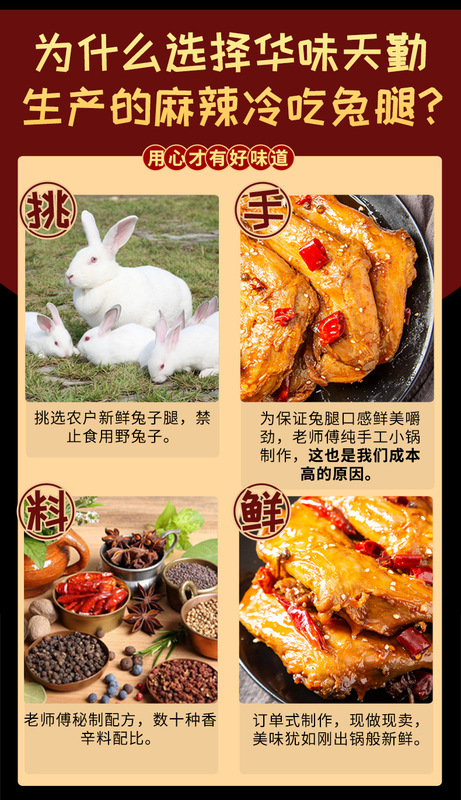 - Packaging specification: Spicy 80g/pack (1 pack, this specification is a small rabbit front leg, custom support large, medium-sized rabbit front and hind legs. Custom support multiple flavors)