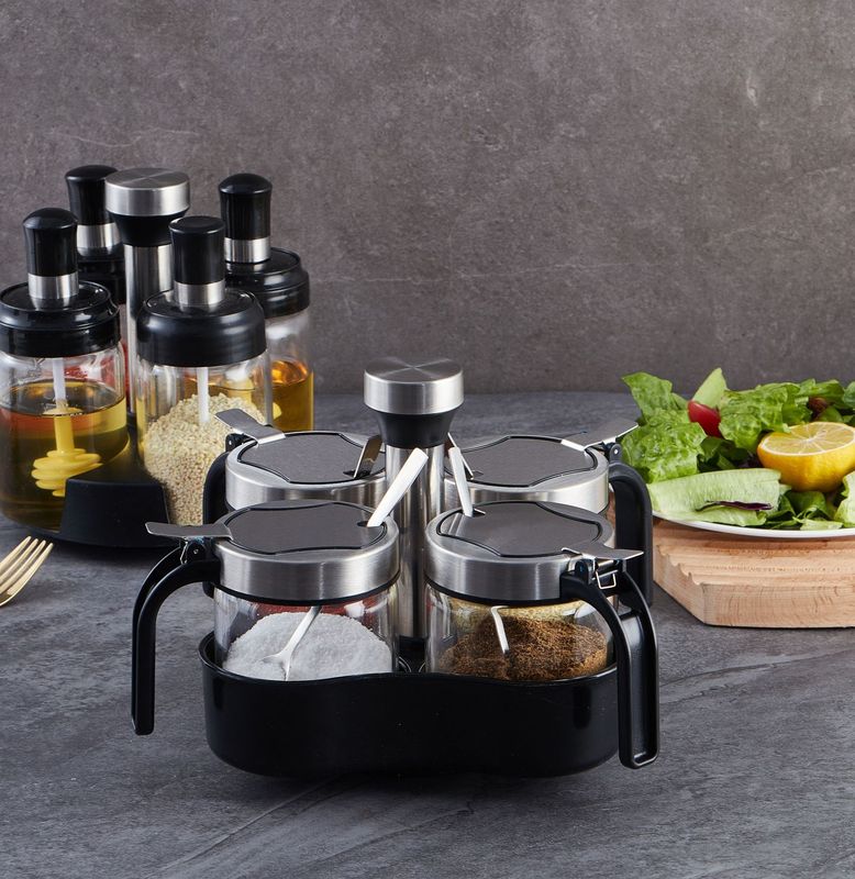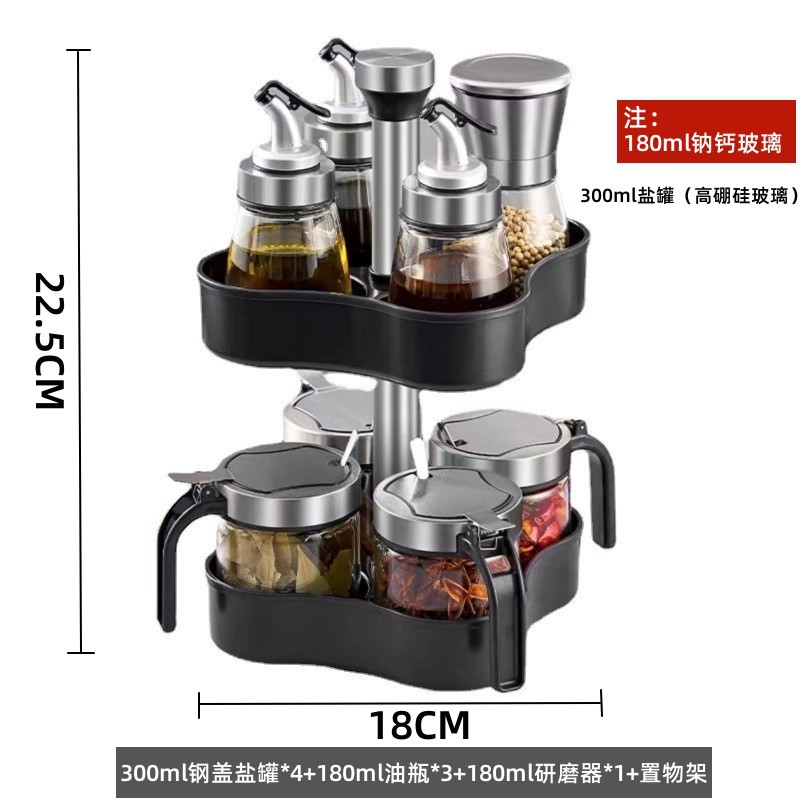 - 規格:300ml鋼蓋鹽罐*4+180ml油瓶*3+180ml研磨器*1+旋轉置物架*1(贈勺)