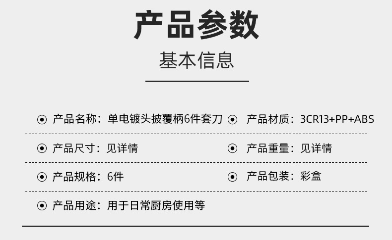 - 規格:圓座單電鍍頭披覆柄6件套刀-彩盒裝