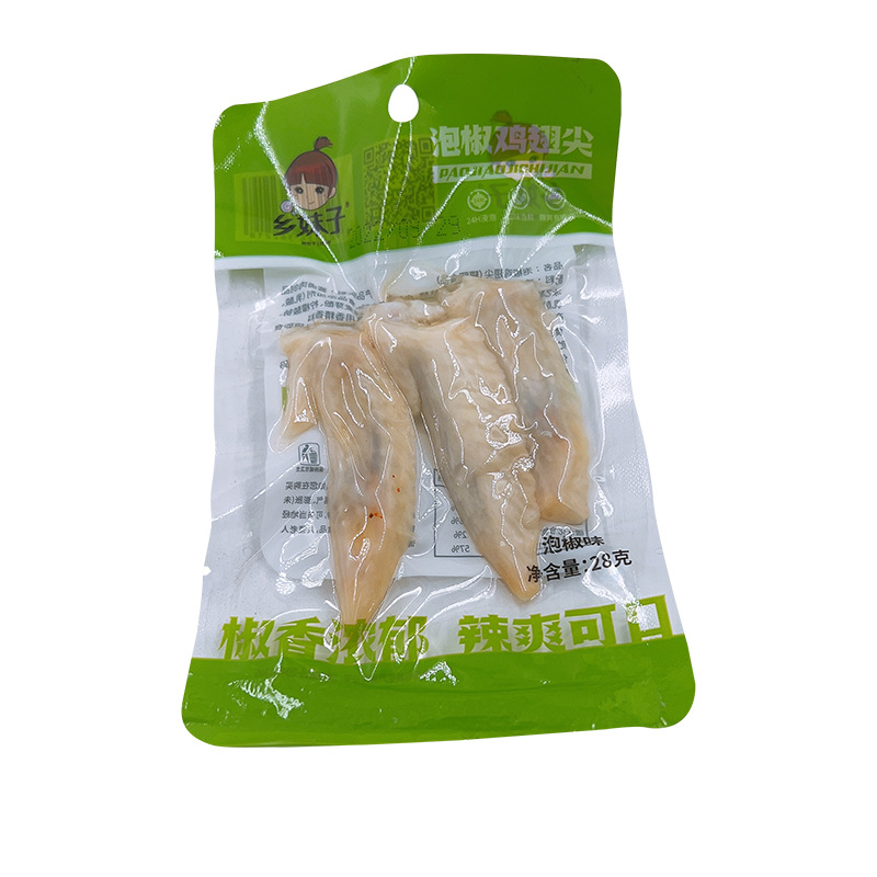 - 包裝規格:鄉妹子28g泡椒味雞翅尖