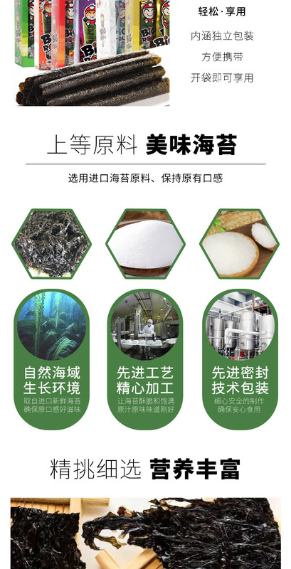 - Ingredients and Compositions: Nori, white sugar, spices, seasoning powder, etc.