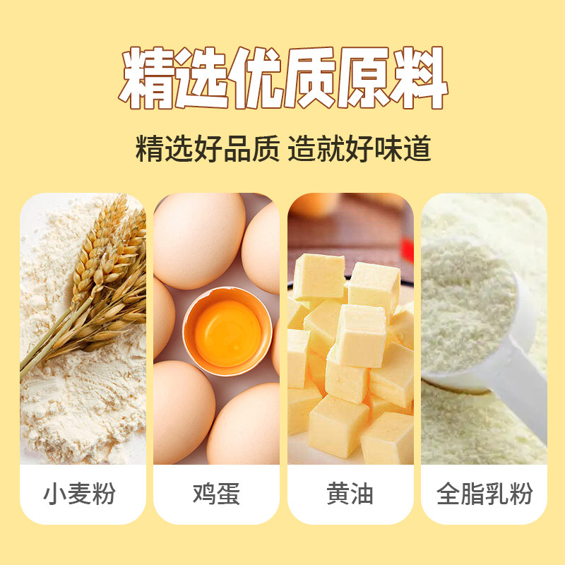 - Ingredients and materials: Wheat flour, edible vegetable oil, white sugar, full-fat milk powder, anhydrous butter, cheese powder, cheese-flavored seasoning granules