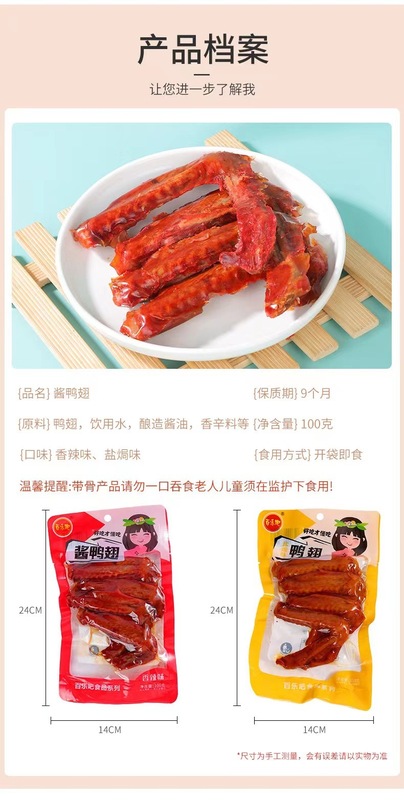 - 包裝規格:100g醬鴨翅(香辣味)