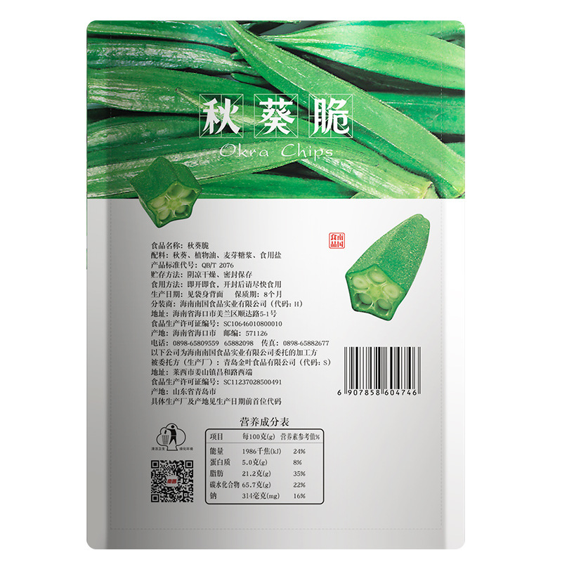 - Ingredients: Okra, edible vegetable oil, malt syrup, edible salt