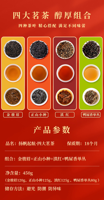 - Ingredients: Fenghuang Dancong Duck Shitxiang, Zhengshan Xiao Zhong, Jin Jun Mei, Dian Hong