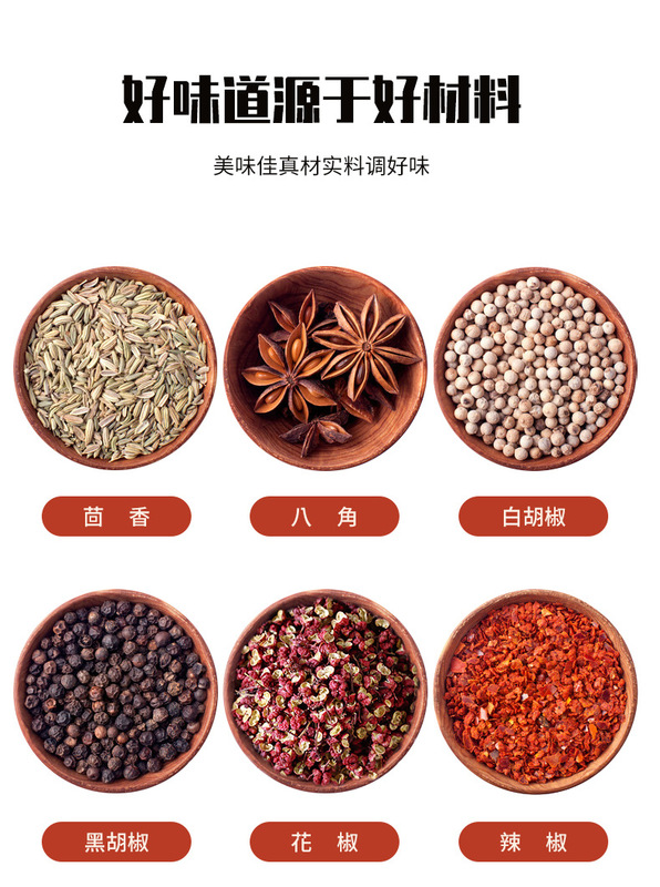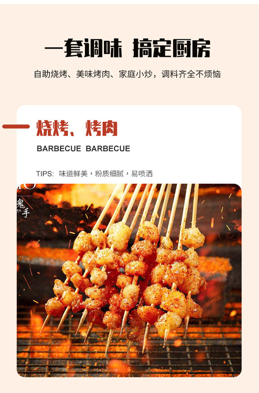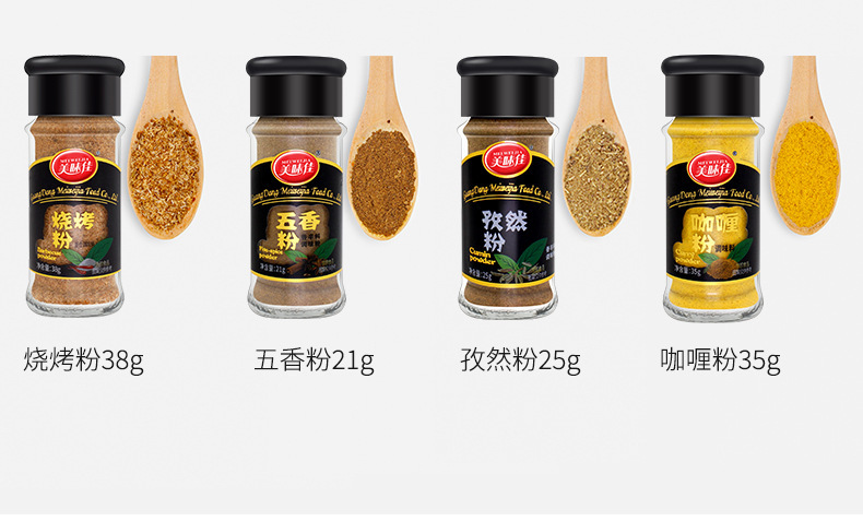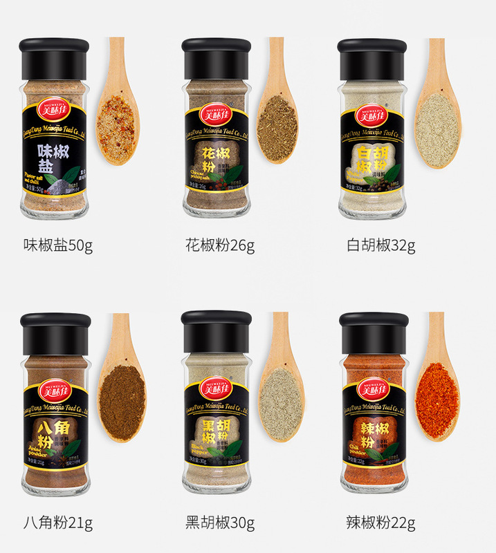 - Ingredients and Compositions: Chili / BBQ / Cumin / Five-Spice / Curry / Star Anise / Sichuan Peppercorn / Black Pepper / White Pepper / Flavor Salt