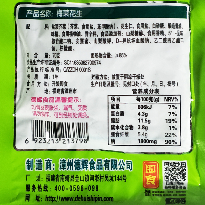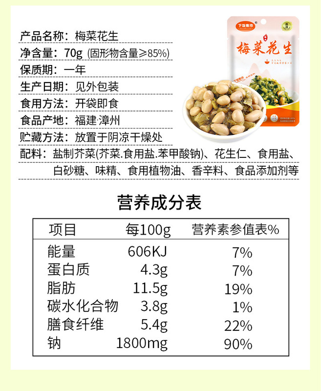 - 原料與配料:芥菜、花生仁、食用鹽、白砂