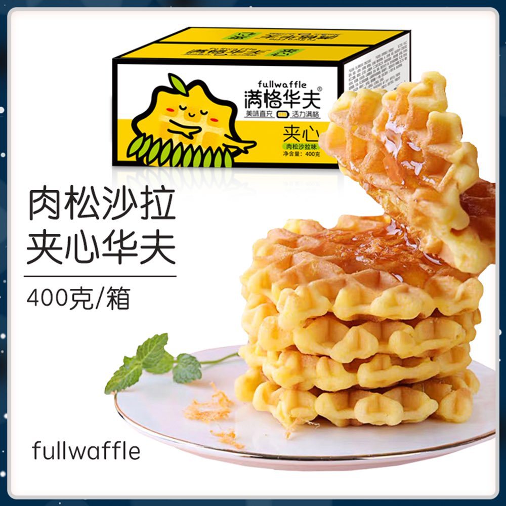 - Packaging specification: Full-grid waffle filling with meat floss and salad flavor 400g (about 11 packs)