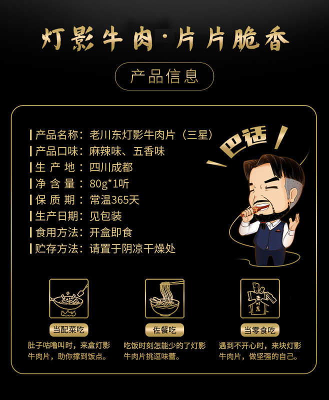 - Ingredients and materials: Beef, vegetable oil, sesame oil, white sugar, edible salt, chili, Sichuan pepper, edible flavoring