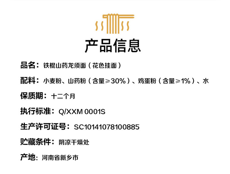 - Ingredients and Materials: Wheat Flour, Chinese Yam Flour (≥30%), Egg Powder (≥1%), Water