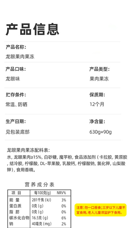 - Ingredients and Materials: Water, Longan Fruit Meat, White Sugar, Konjac Flour, etc.