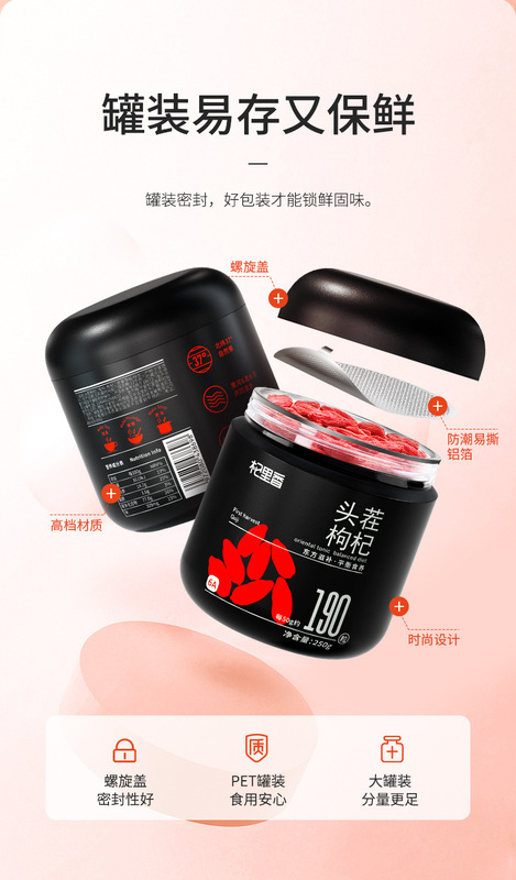 - Packaging Size: Qili Fragrance 250g Round Canned Goji Berry Heads 190 Pieces