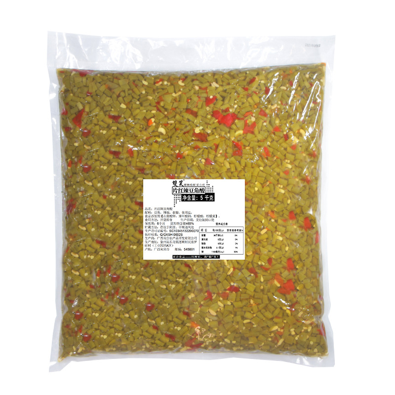- Packaging Specification: 5kg*5 bags sliced red chili acid green beans