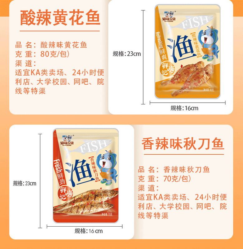 - Packaging specifications: 80g sour-spicy-flavor small fish bites