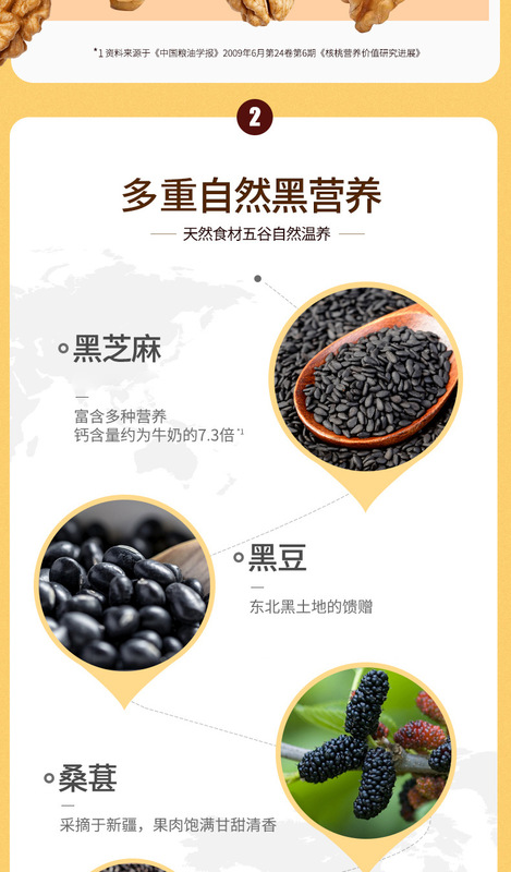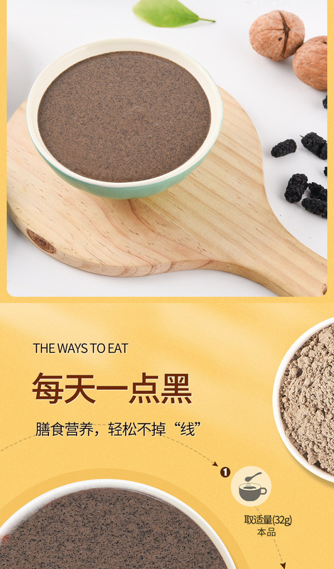 - Main Nutritional Components: Black sesame, walnuts, mulberries, black beans, black rice, etc.