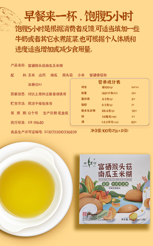 - Main Nutritional Ingredients: Corn, Chinese Yam, Hericium erinaceus, Pumpkin, Millet, Selenium-rich Mushroom Powder