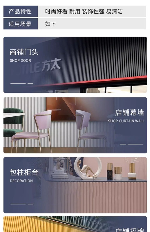 - Application: Storefront signs, backdrop walls, curtain walls