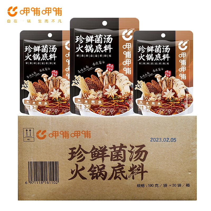 - Packaging Specification: Xiabu Fresh Mushroom Soup Base 190g*30 Bags/Box