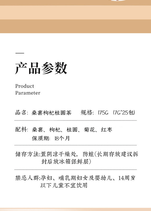 - Packaging Specification: Mulberry, Goji Berry, Longan Tea (7g*25 packs)