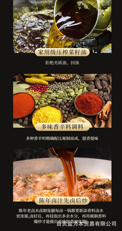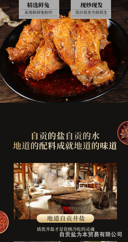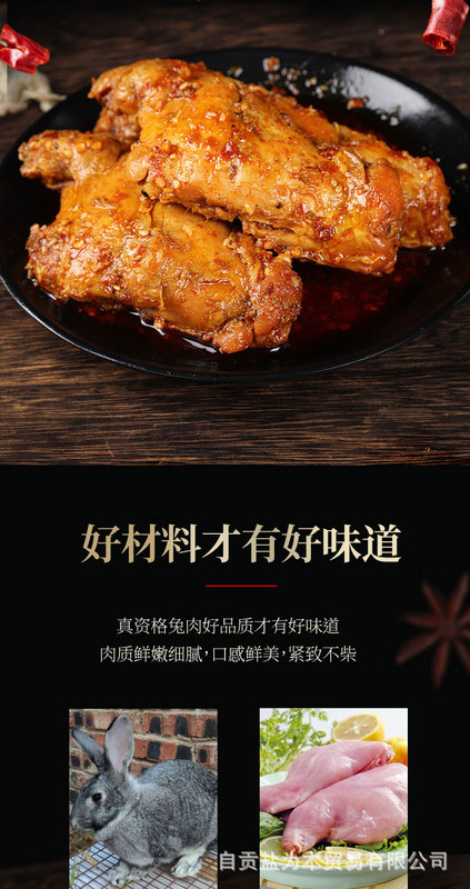 - 原料和配料:兔後腿、食用植物油、辣椒、食用鹽、冰糖、味精、雞精調味料、香辛料、食品添加劑(D-異抗壞血酸鈉、