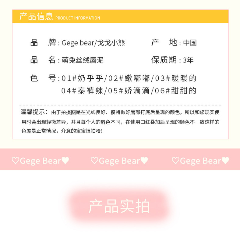 - Product Name: Gegebear Bunny Fluffy Lip Mud 01#