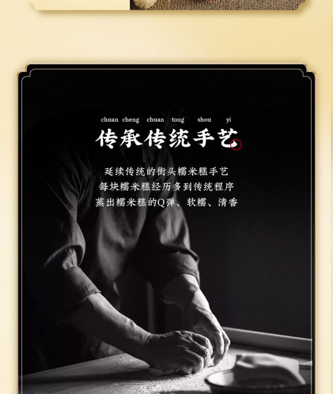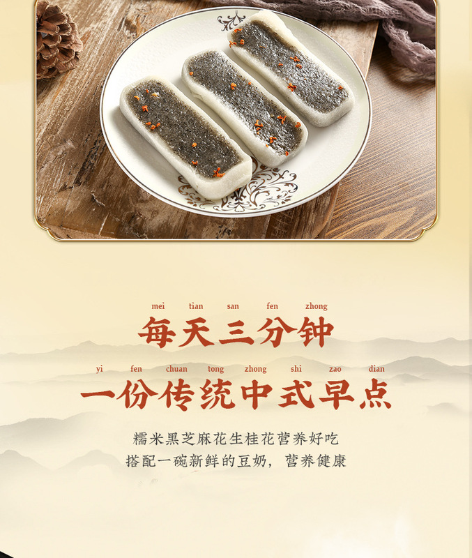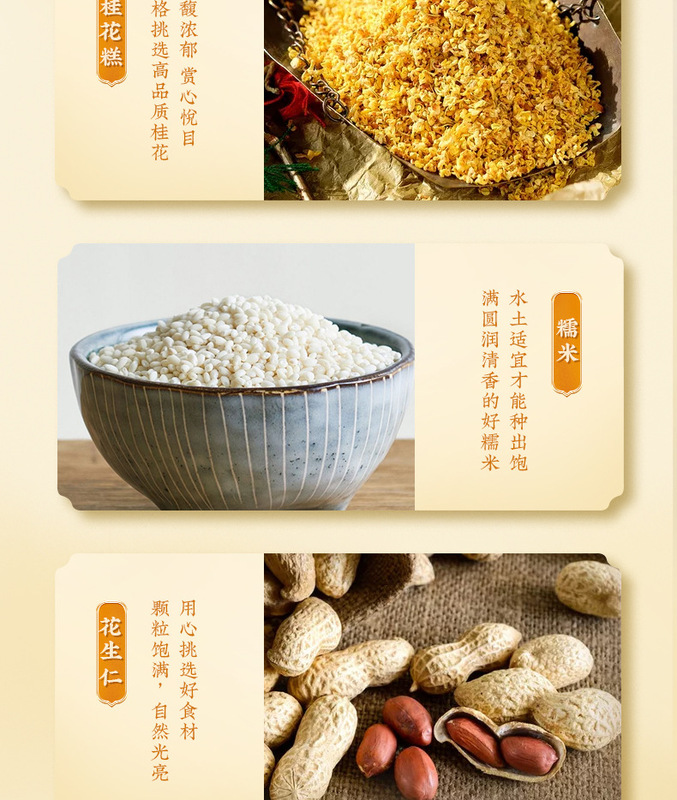 - Raw materials and ingredients: Glutinous rice flour, black sesame, white sugar, osmanthus, peanuts, drinking water