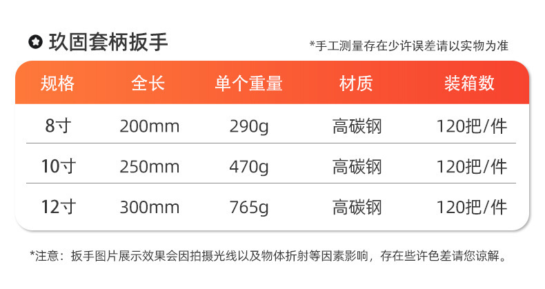 - 規格型號:管活兩用扳手10寸(一盒6把一箱60把)8