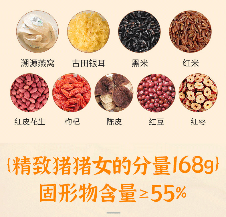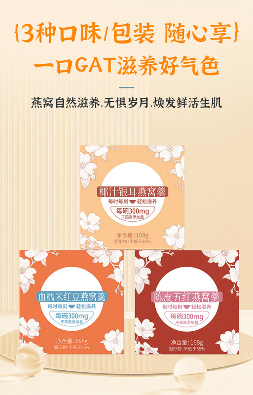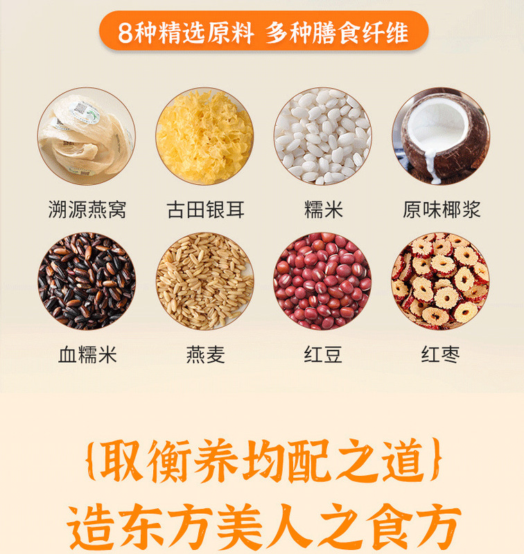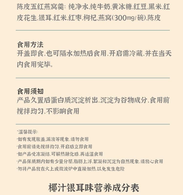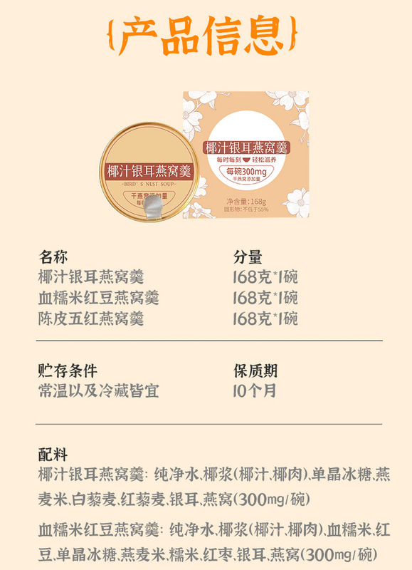 - Nutritional Ingredients: Coconut Juice, Tremella, Red Beans, Glutinous Rice, Tangerine Peel, Five Red Beans, Bird's Nest