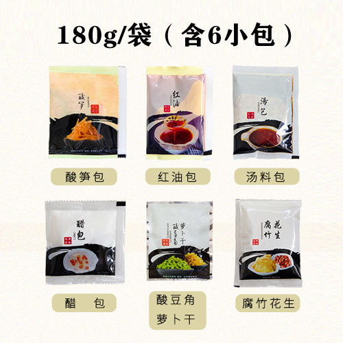 - 原料與配料:湯料包、辣椒油包、腐竹花生包、酸筍包、豆角蘿蔔乾包、醋包