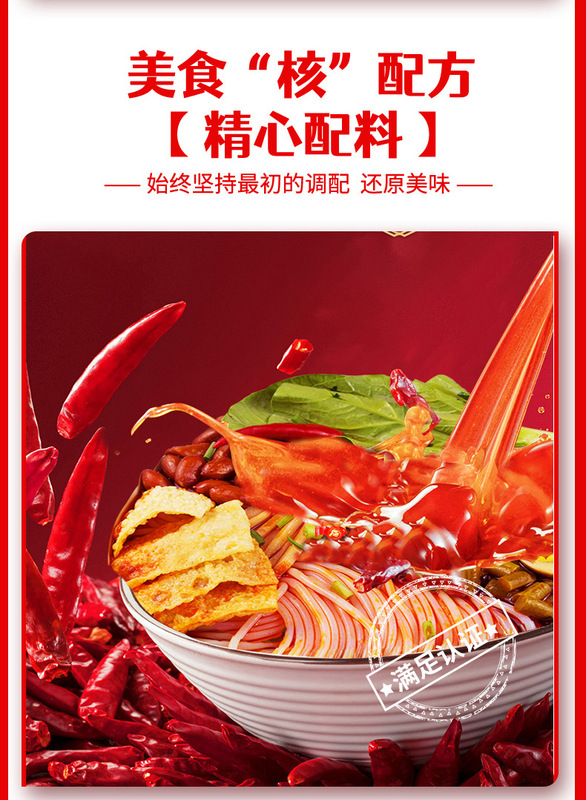 - Ingredients and accessories: Rice noodle pack, soup base pack, chili oil pack, tofu and peanut pack, sour bamboo shoot pack, bean and radish dry pack, vinegar pack