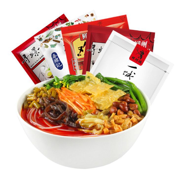 - Ingredients and accessories: Rice noodle pack, broth pack, chili oil pack, soybean skin and peanut pack, sour bamboo shoot pack, bean and radish dry vegetable pack, vinegar pack