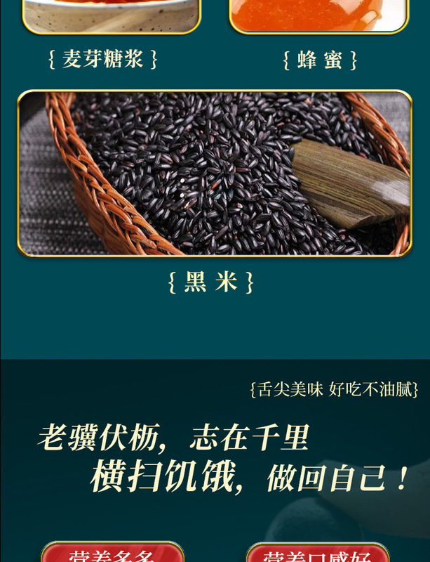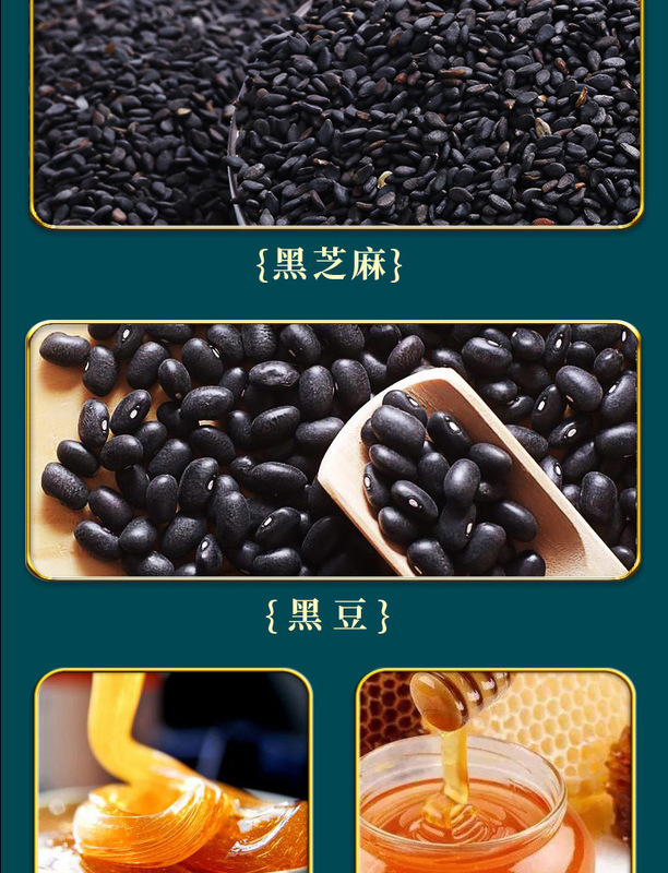 - Main Ingredients: Black Sesame, Black Beans, Black Rice, Malt Syrup, Honey