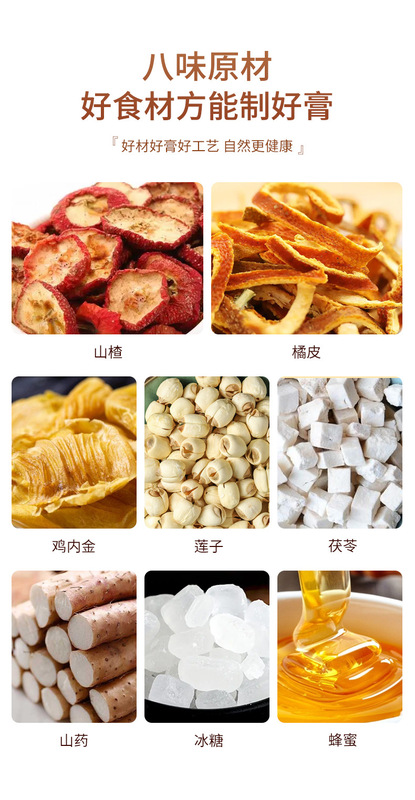 - Main Ingredients: Shanzha (Hawthorn), Tangerine Peel, Chicken Gizzard, Lotus Seeds, Poria, Chinese Yam, Rock Sugar, Honey