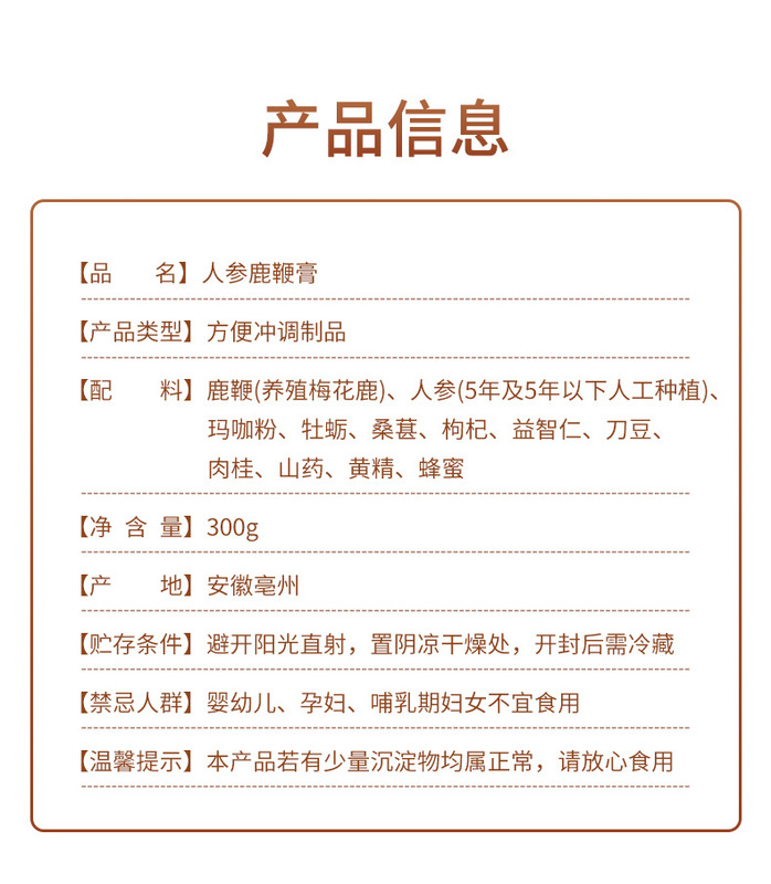 - Packaging Specification: Ginseng and Deer Velvet Essence Paste 300g