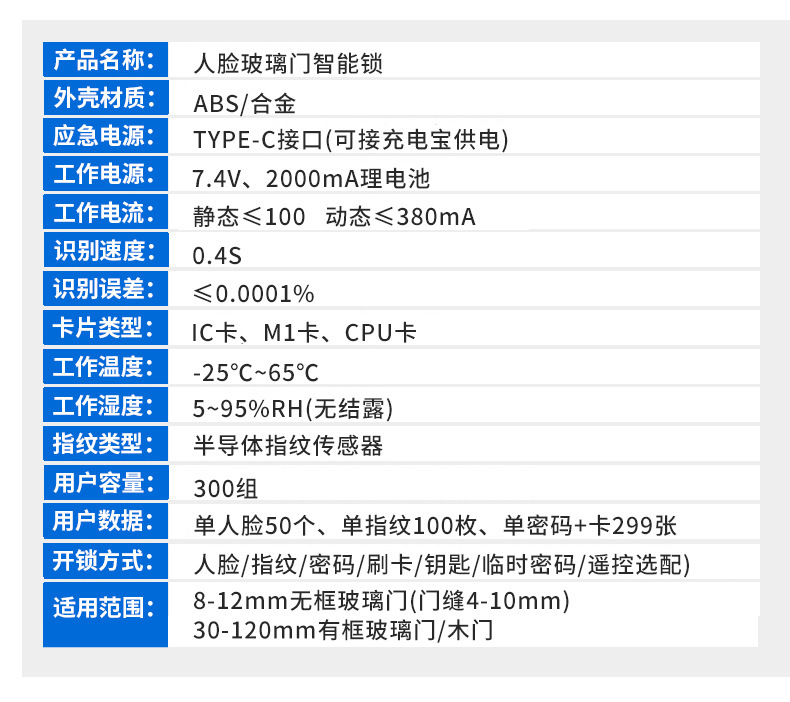 - 規格:雙門【密碼+刷卡+藍牙+指紋+鑰匙+人臉】