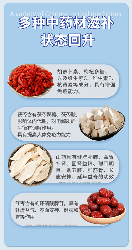 - Main Ingredients: Compound Amino Powder, Goji Berries, Poria, Chinese Yam, Jujubes, White Sugar