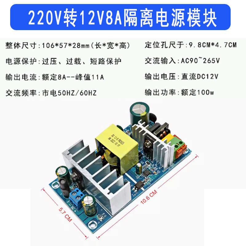 - Model: 220V to 12V 8A isolated module (with terminal blocks)