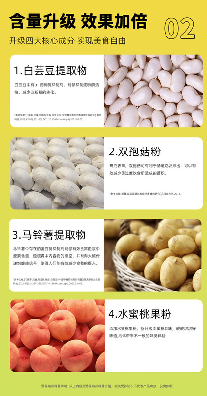 - Main Ingredients: Sorbitol, White Kidney Bean Extract, Beneficial Mushroom Powder, Potato Extract, etc.