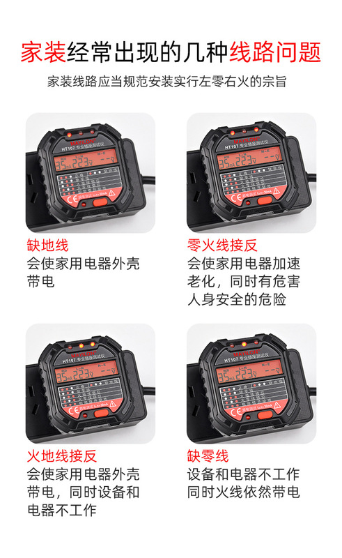 - Purpose: Correct wiring method, lack of live wire/ground wire/neutral wire
