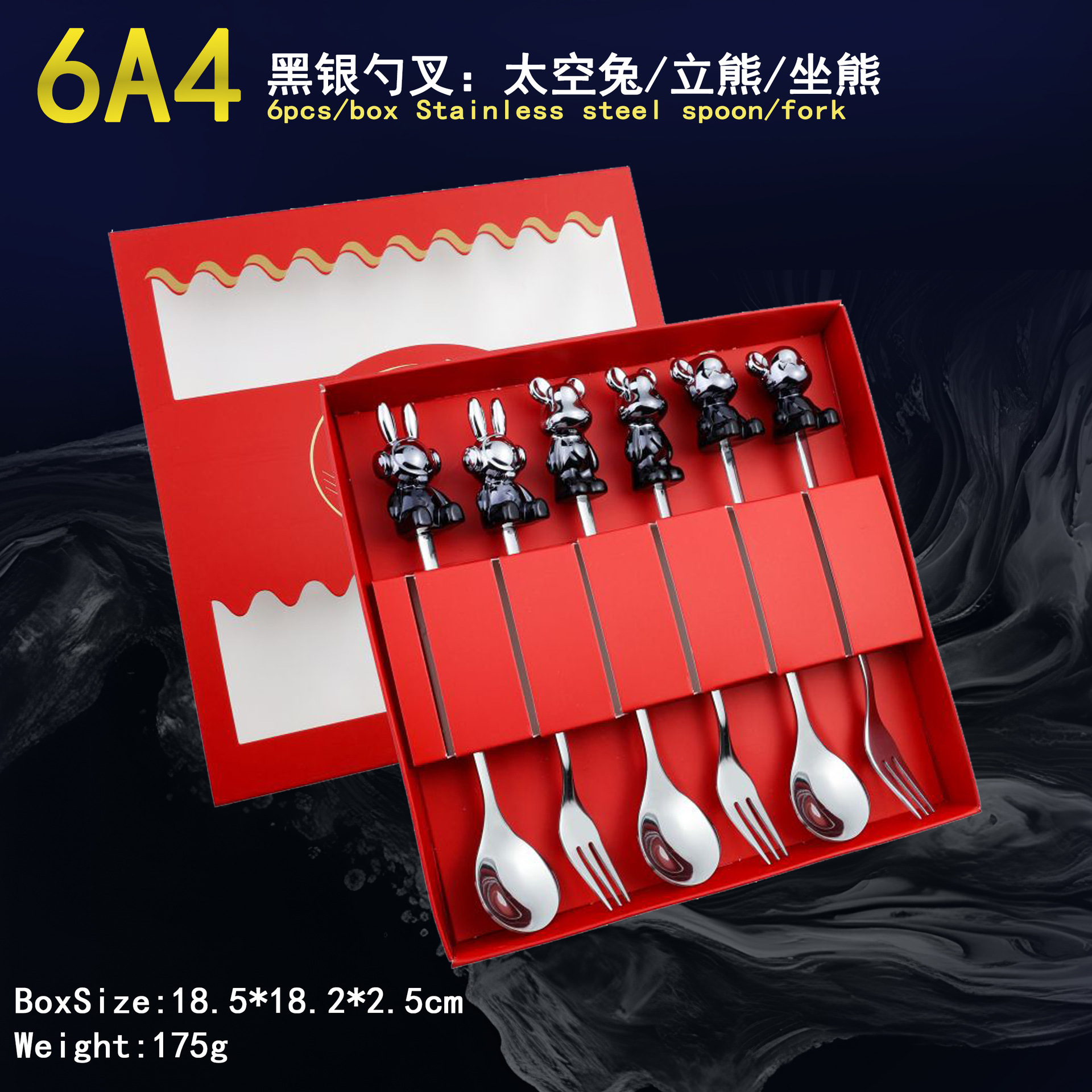 - Specification: 6A4-Spoon/Fork six-piece set-Black Silver