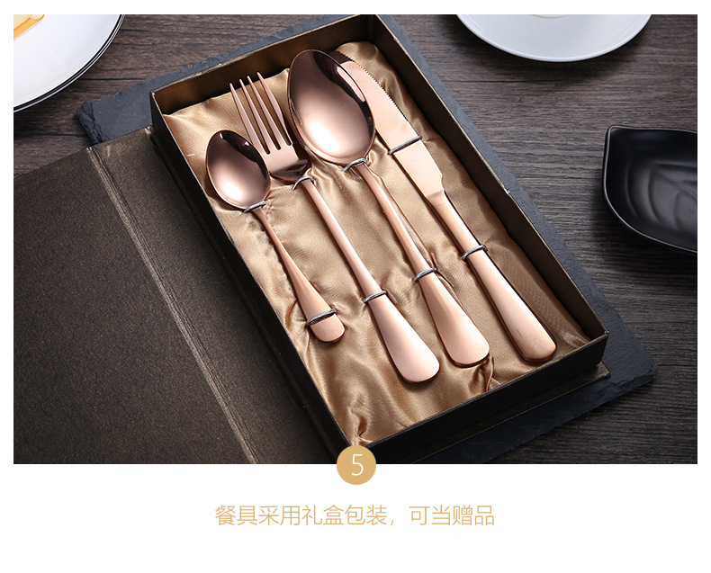 - Specification: Rose gold knife, fork, spoon 4-piece set + gift box