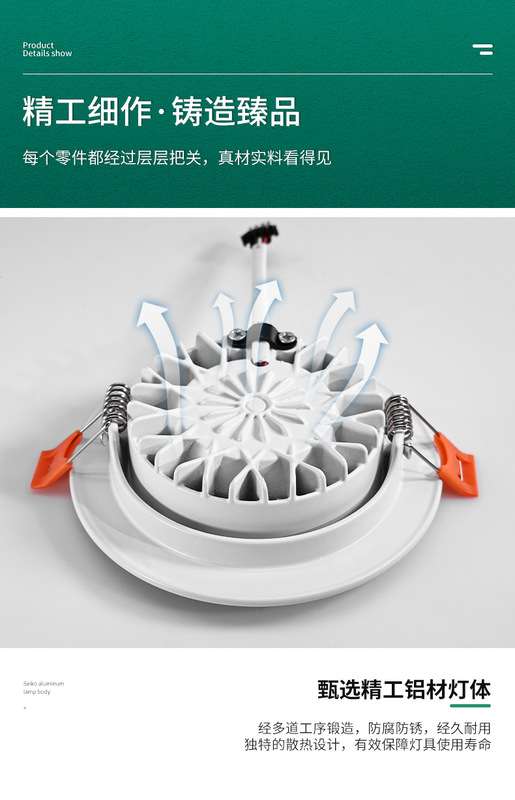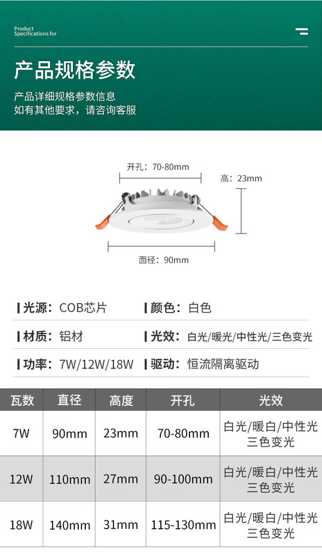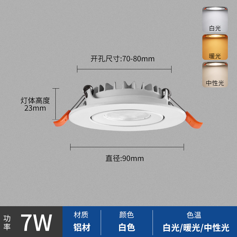 - Power: 7W, Diameter 90mm, Height 23mm, Cut-out Size 70-80mm
