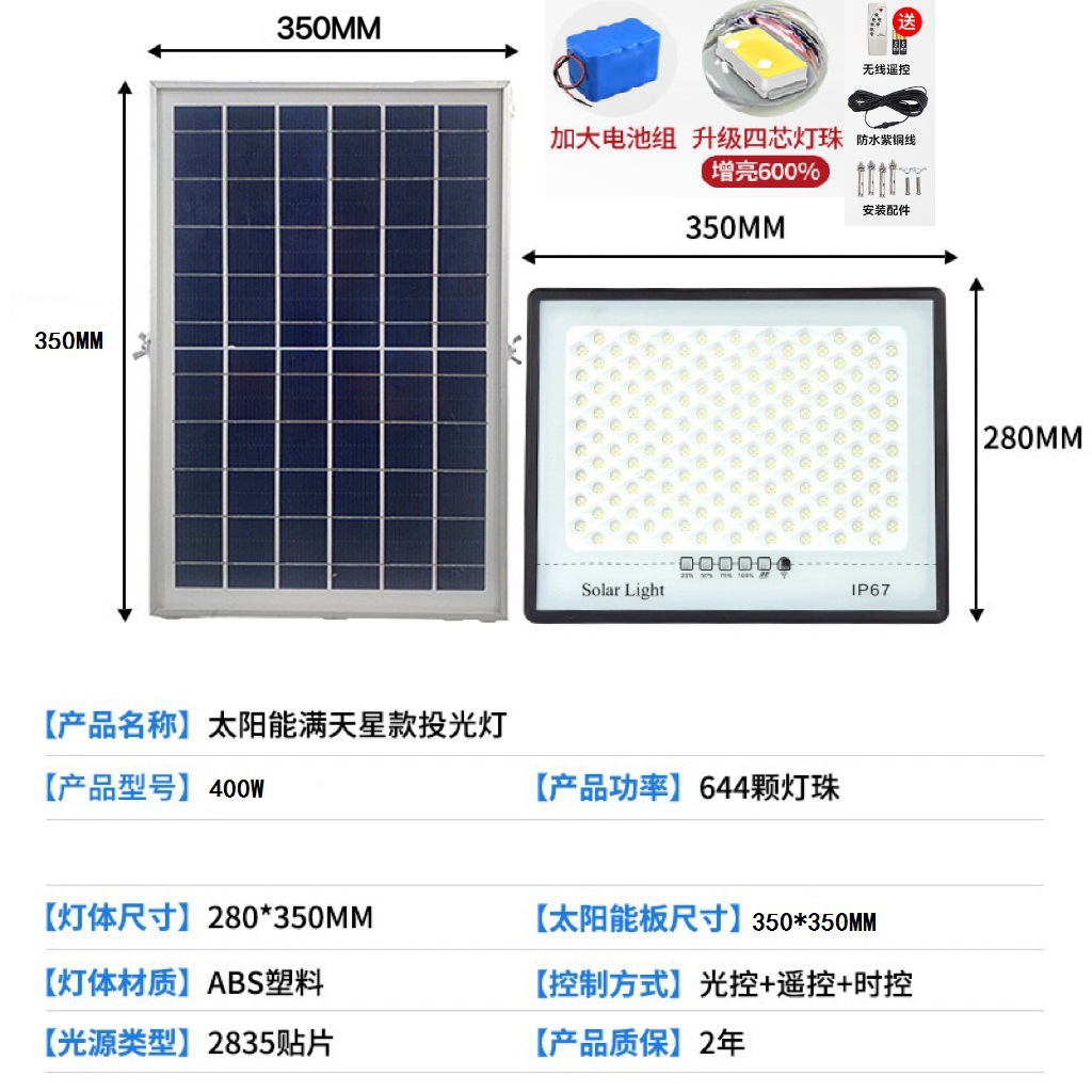 - 規格分類:頂配款400W【644顆納米燈珠】光控+遙控定時+電量顯示