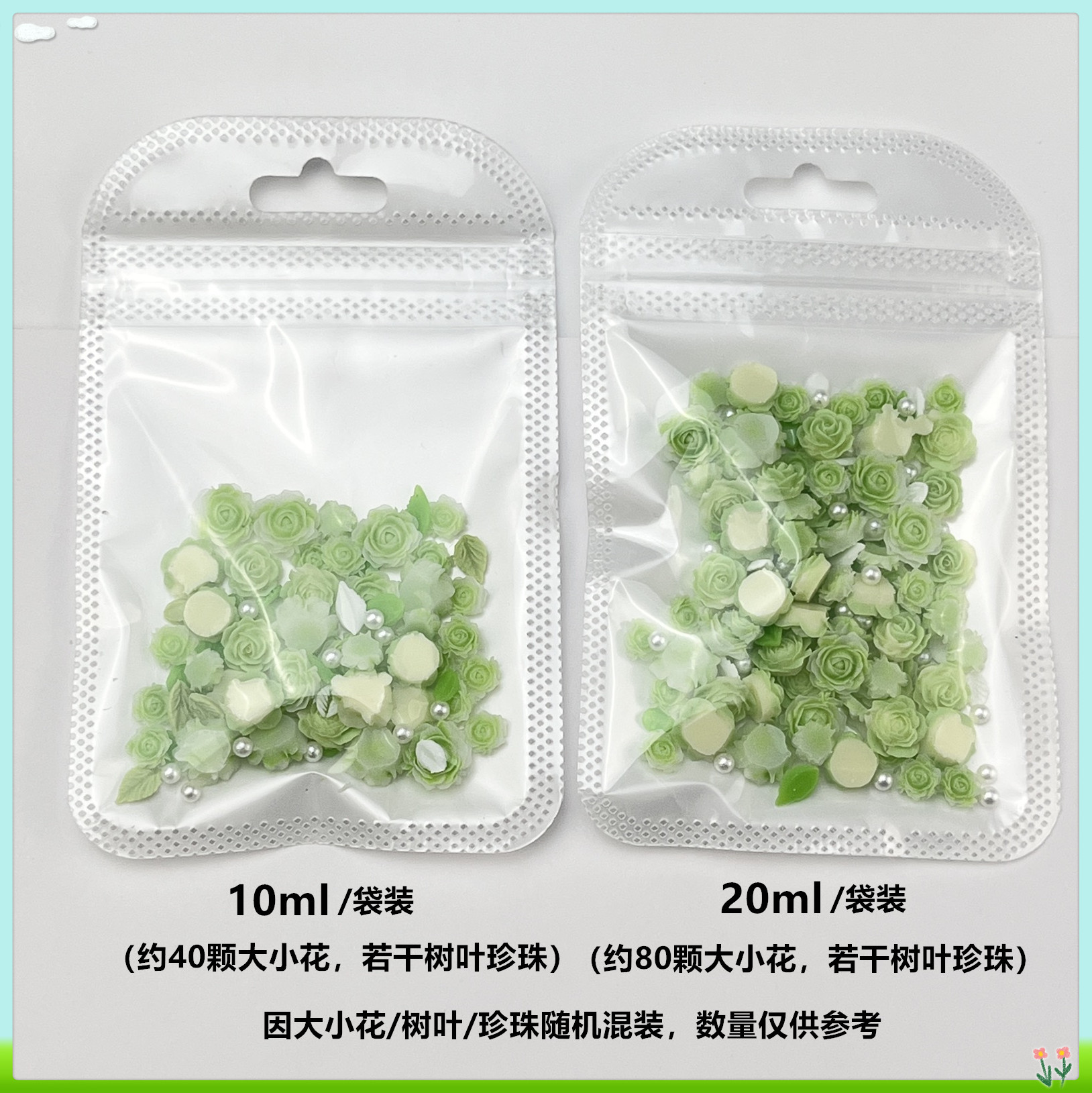 - Specification Type: 20ml Bag (approx. 80 large and small flowers + several leaves and pearls)